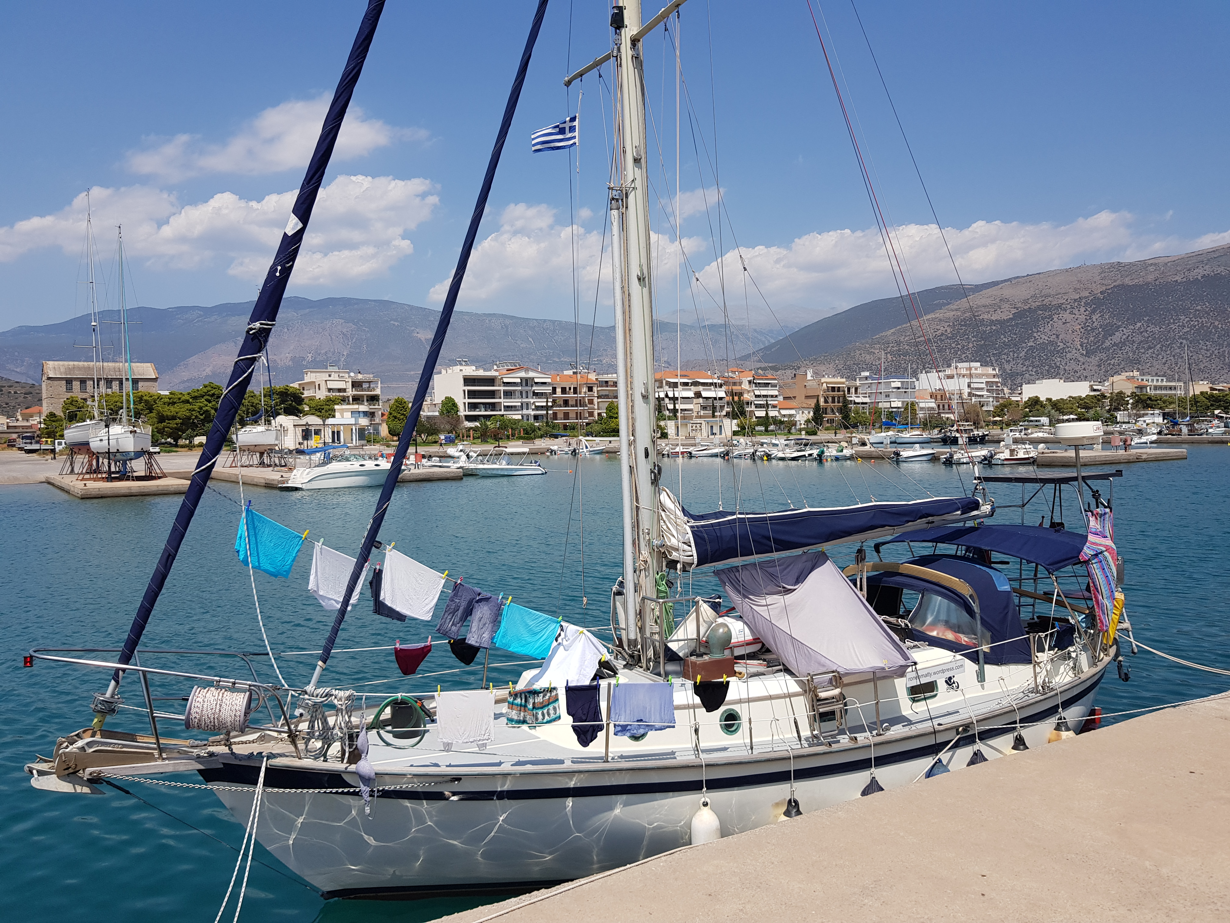 Like real northerners, Ron and I can’t help but also try to do something useful in the middle of the day: the laundry, a chore, a bit of cleaning, cooking and writing this blog. Less and calmer than normal, but too much by Greek standards. The heat wave has now lasted more than a week and here on the Gulf of Corinth daily temperatures reach around 40 degrees. The further the afternoon progresses, the warmer it gets. The wind is coming down and even the crickets give up. When finally a strong wind picks up, it feels like someone has switched on a hair dryer at the hardest and hottest setting. Our attempts to keep the boat cool with cloths against the sun, an extra dorade and a fan deliver only minimal results.