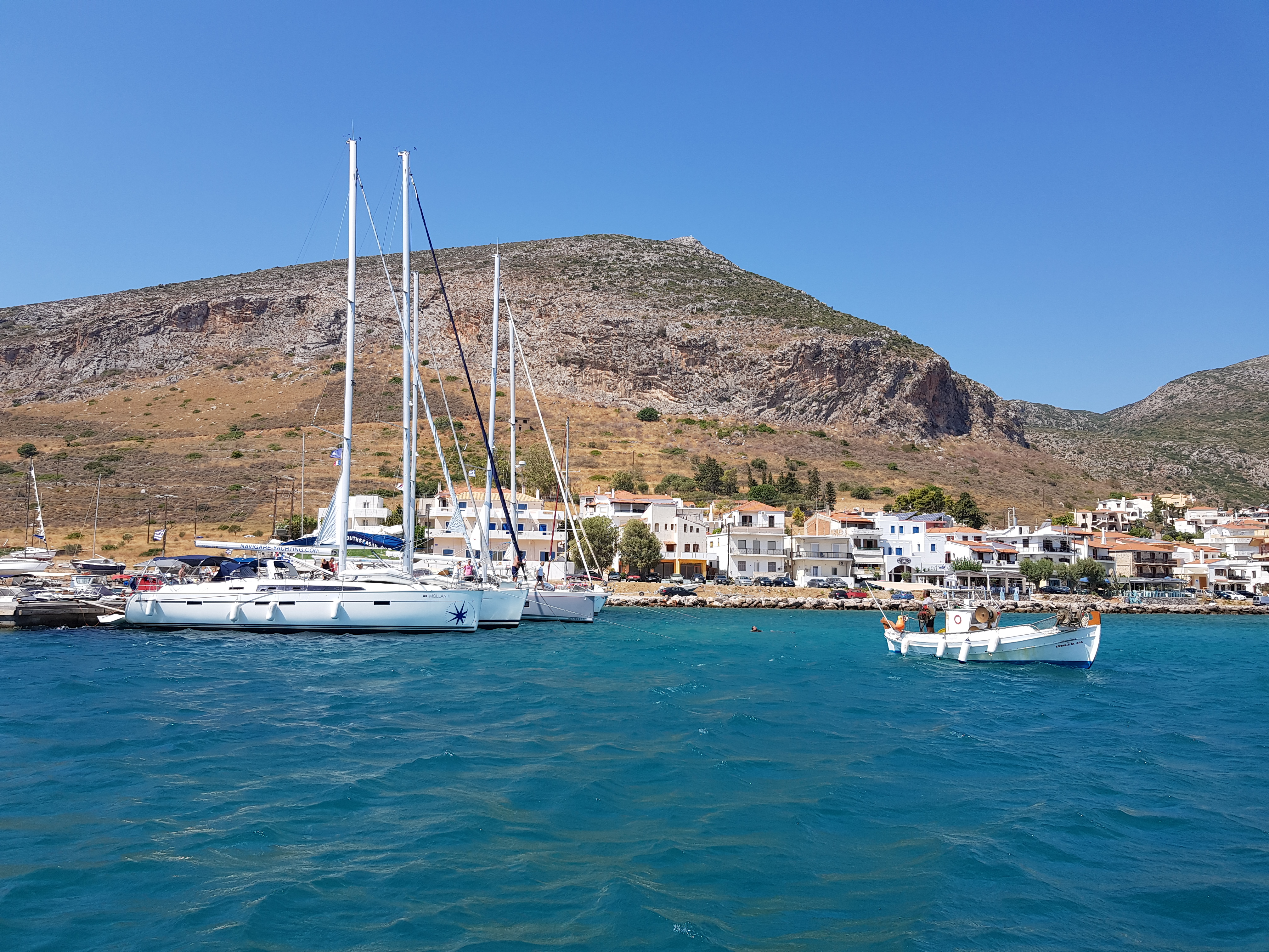 After four days of wonderful sailing from Astros to Tyros, Sabatiki and Kiparisi we have arrived in Monemvasia on the edge of the area where the Meltemi reigns in the summer months. And we will know it. As predicted, it starts to blow hard the day after our arrival and only stops briefly in between.