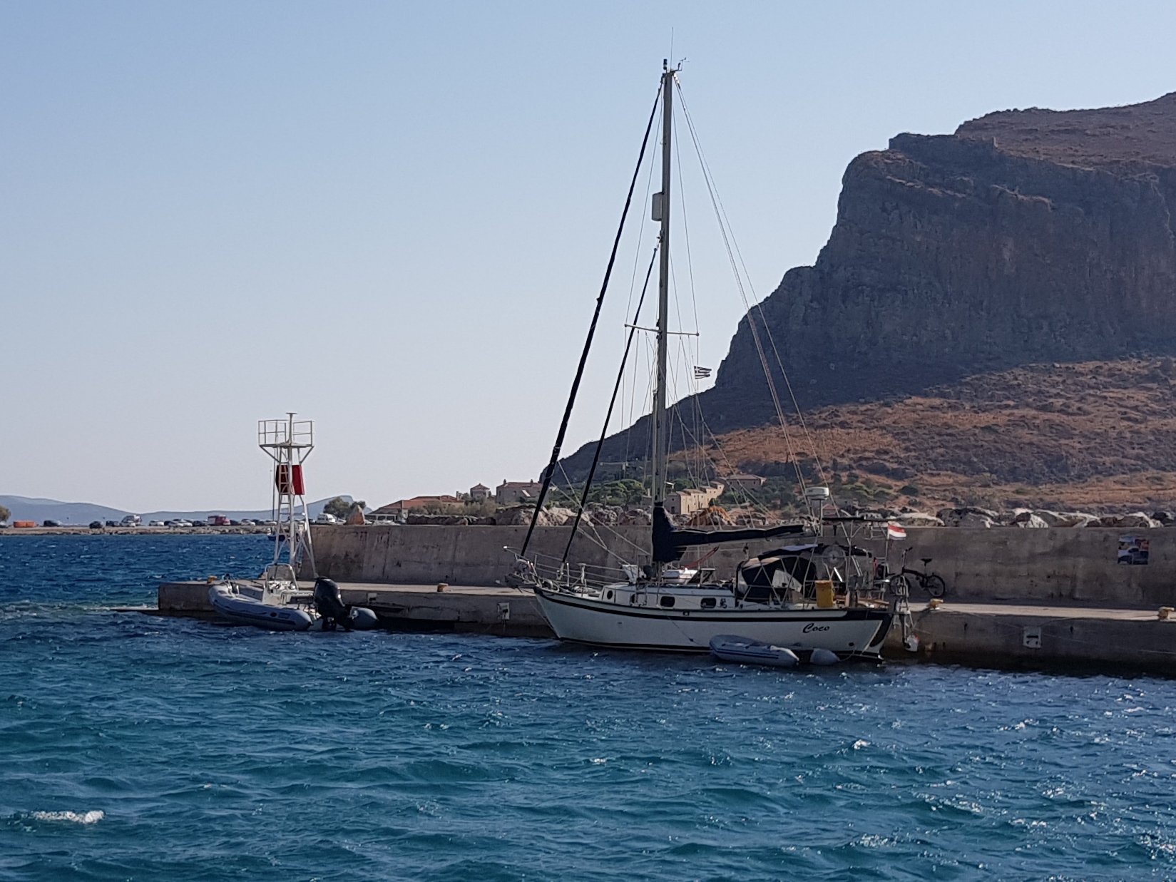 It is still dark when I wake up. “Where are we again?” is the first thing that springs to mind. There is a stiff breeze. The mooringlines are pulling our Coco. I’m not comfortable with it. After lying awake for an hour, listening and lurking through the portholes, I get up with the first dash of daylight. It’s not a moment too early. It is chaos in the harbor of Monemvasia.
