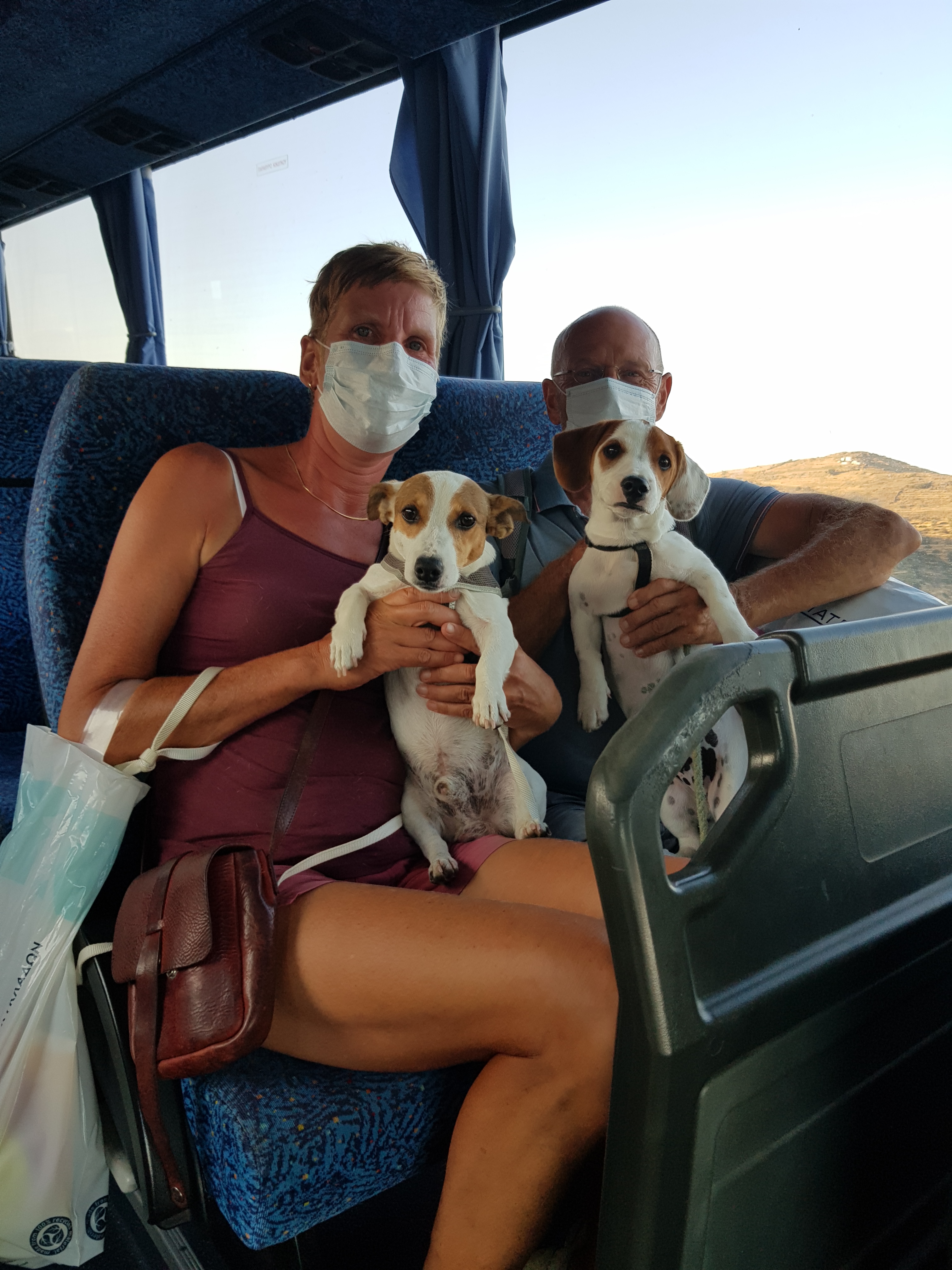 However, the engine is not our only problem. We are busy selling our old Cornish Crabber Janna. There seems to be a serious buyer and we have to fill in, sign and print papers. The latter is a problem, however. We don’t succeed anywhere on Koufonisi. Nobody can or wants to help us. Once arrived at Sifnos we have to make a bus trip to the next village. At the same time we can take Sammie to the vet for his last vaccinations. Meanwhile, Jack is still acting like a priest in a boys’ boarding school with Sammie as a new apprentice.
