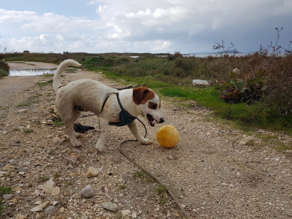Allthough a Greek doglife may not be without dangers, it is often a free life. Many dogs, including those with an owner, spend most of the time wandering around on the street. And the real stray dogs without owners often have their addresses where they get something to eat. It is still good practice here not to throw away food and to feed leftovers to dogs, cats or, if necessary, the fish. And there is also plenty of edible outside here for our always crazy hungry Sammie: a dead crab, the intestines of an eaten coypu, gnawing on a piece of skull or the horn of a sheep. It’s all possible here. The dry dogfood that someone has deposited at the port remains untouched. Only Sammie wants it, but he doesn’t get it.
